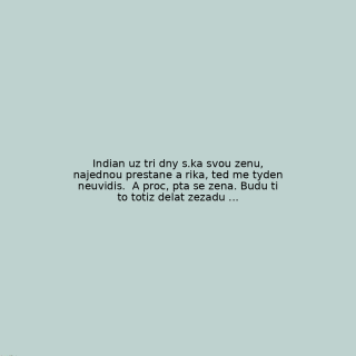 Indian uz tri dny s.ka svou zenu, najednou prestane a rika, ted me tyden neuvidis. A proc, pta se zena. Budu ti to totiz delat zezadu ...