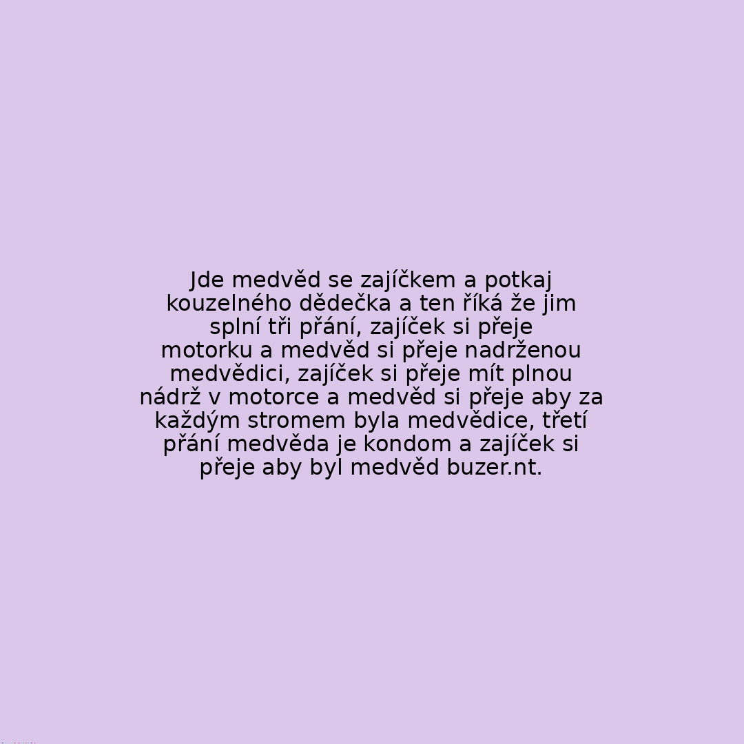 Jde medvěd se zajíčkem a potkaj kouzelného dědečka a ten říká že jim splní tři přání, zajíček si přeje motorku a medvěd si přeje nadrženou medvědici, zajíček si přeje mít plnou nádrž v motorce a medvěd si přeje aby za každým stromem byla medvědice, třetí přání medvěda je kondom a zajíček si přeje aby byl medvěd buzer.nt.