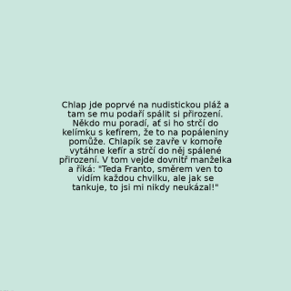 Chlap jde poprvé na nudistickou pláž a tam se mu podaří spálit si přirození. Někdo mu poradí, ať si ho strčí do kelímku s kefírem, že to na popáleniny pomůže. Chlapík se zavře v komoře vytáhne kefír a strčí do něj spálené přirození. V tom vejde dovnitř manželka a říká: "Teda Franto, směrem ven to vidím každou chvilku, ale jak se tankuje, to jsi mi nikdy neukázal!"