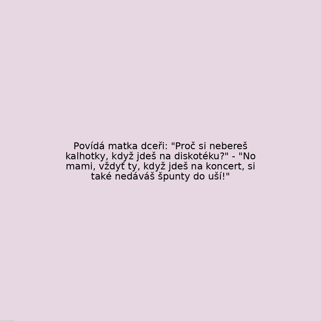 Povídá matka dceři: "Proč si nebereš kalhotky, když jdeš na diskotéku?" - "No mami, vždyť ty, když jdeš na koncert, si také nedáváš špunty do uší!"