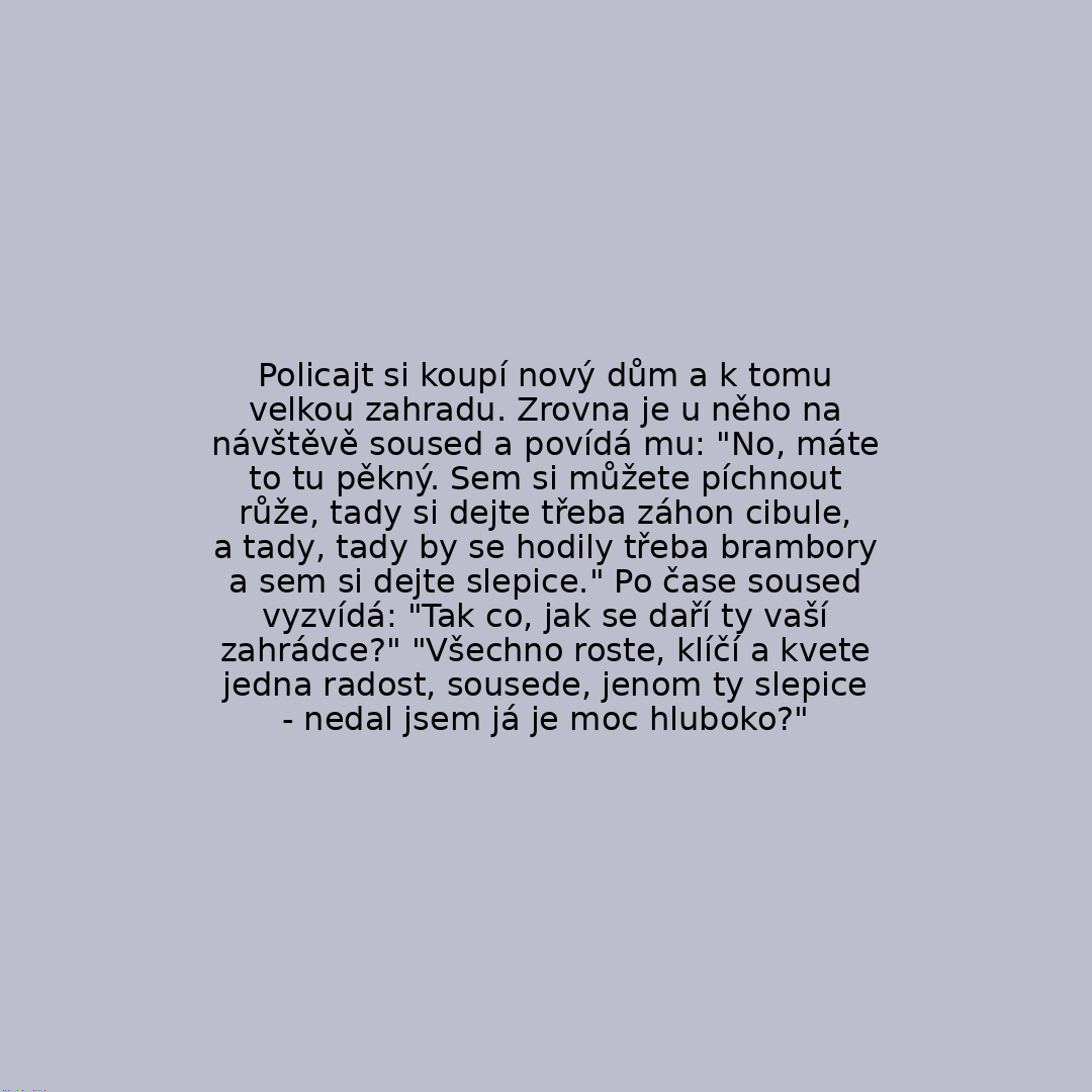 Policajt si koupí nový dům a k tomu velkou zahradu. Zrovna je u něho na návštěvě soused a povídá mu: "No, máte to tu pěkný. Sem si můžete píchnout růže, tady si dejte třeba záhon cibule, a tady, tady by se hodily třeba brambory a sem si dejte slepice." Po čase soused vyzvídá: "Tak co, jak se daří ty vaší zahrádce?" "Všechno roste, klíčí a kvete jedna radost, sousede, jenom ty slepice - nedal jsem já je moc hluboko?"