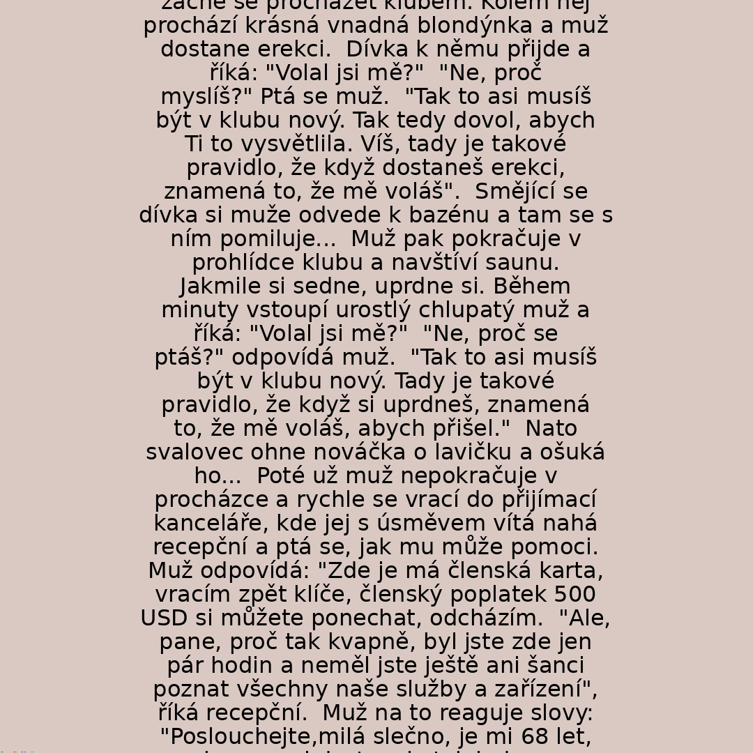 "Tak to asi musíš být v klubu nový. Tak tedy dovol, abych Ti to vysvětlila. Víš, tady je takové pravidlo, že když dostaneš erekci, znamená to, že mě voláš".