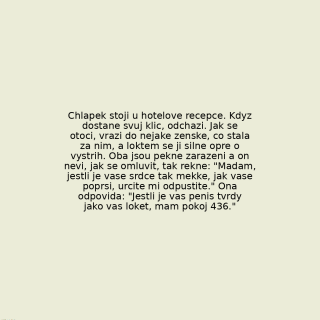 Chlapek stoji u hotelove recepce. Kdyz dostane svuj klic, odchazi. Jak se otoci, vrazi do nejake zenske, co stala za nim, a loktem se ji silne opre o vystrih. Oba jsou pekne zarazeni a on nevi, jak se omluvit, tak rekne: "Madam, jestli je vase srdce tak mekke, jak vase poprsi, urcite mi odpustite." Ona odpovida: "Jestli je vas penis tvrdy jako vas loket, mam pokoj 436."