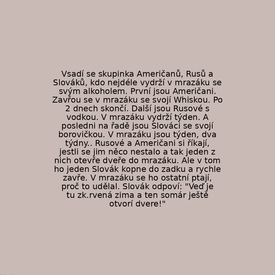 Vsadí se skupinka Američanů, Rusů a Slováků, kdo nejdéle vydrží v mrazáku se svým alkoholem. První jsou Američani. Zavřou se v mrazáku se svojí Whiskou. Po 2 dnech skončí. Další jsou Rusové s vodkou. V mrazáku vydrží týden. A posledni na řadě jsou Slováci se svojí borovičkou. V mrazáku jsou týden, dva týdny.. Rusové a Američani si říkají, jestli se jim něco nestalo a tak jeden z nich otevře dveře do mrazáku. Ale v tom ho jeden Slovák kopne do zadku a rychle zavře. V mrazáku se ho ostatní ptají, proč to udělal. Slovák odpoví: "Veď je tu zk.rvená zima a ten somár ještě otvorí dvere!"