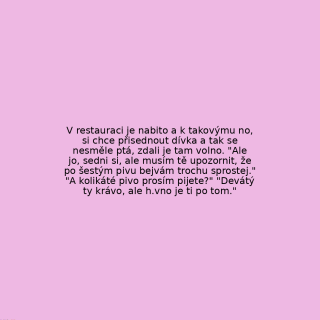 V restauraci je nabito a k takovýmu no, si chce přisednout dívka a tak se nesměle ptá, zdali je tam volno. "Ale jo, sedni si, ale musím tě upozornit, že po šestým pivu bejvám trochu sprostej." "A kolikáté pivo prosím pijete?" "Devátý ty krávo, ale h.vno je ti po tom."